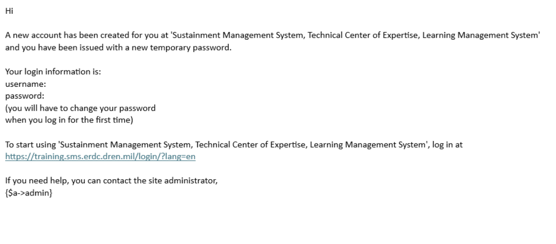 SMS LMS users may have received emails this afternoon similar to the emails below from SMS Training ERDC-RDE-CERL-IL (smstraining@erdc.dren.mil). The emails were official Moodle communication sent as a result of troubleshooting efforts that resolved an issue with backlogged emails, and can be ignored.